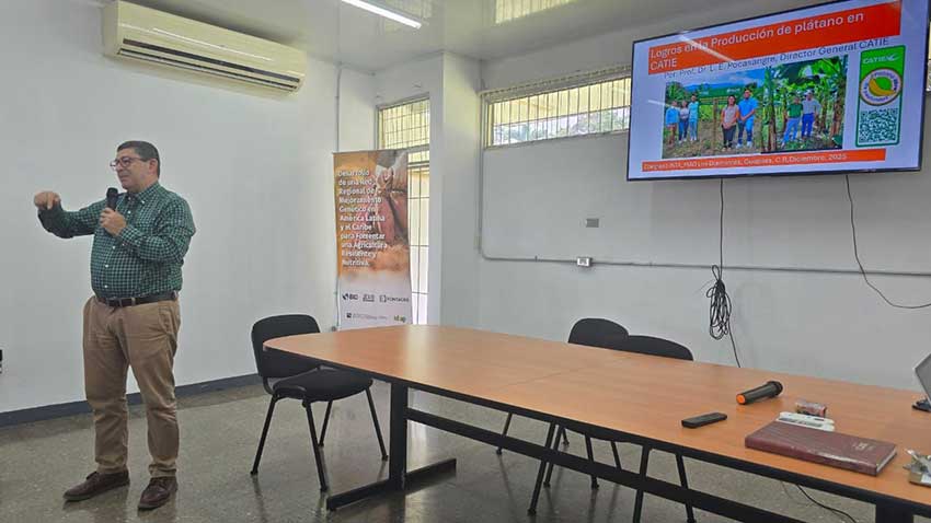 Durante el evento, el Director General del CATIE, Dr. Luis Pocasangre, compartió los avances de la institución en investigación y producción de plátano, destacando el valor del trabajo conjunto para llevar soluciones innovadores al campo.