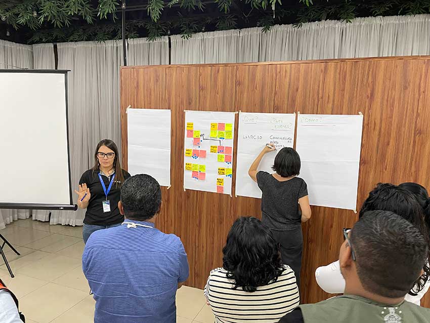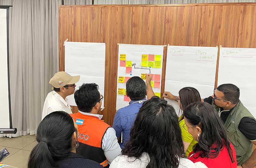 Asimismo, en el bloque de políticas y gobernanza, se trabajó en un paquete de ideas para fortalecer la incidencia y la articulación multiactor y multinivel. Entre los énfasis destacados estuvieron: la generación de sinergias con el proceso de actualización de la NDC (hacia NDC 3.0) mediante socialización y mensajes estratégicos; el impulso de alianzas público–privadas para la protección y restauración de recursos hídricos; y el fortalecimiento de la gobernanza de datos para la toma de decisiones, incluyendo la estandarización de información, la mejora de flujos de reporte y la vinculación de esfuerzos de monitoreo (incluido el comunitario) con plataformas e instituciones nacionales. Estas líneas se discutieron incorporando, además, criterios transversales para integrar enfoques de género, ambiente y cambio climático en la planificación y la implementación.