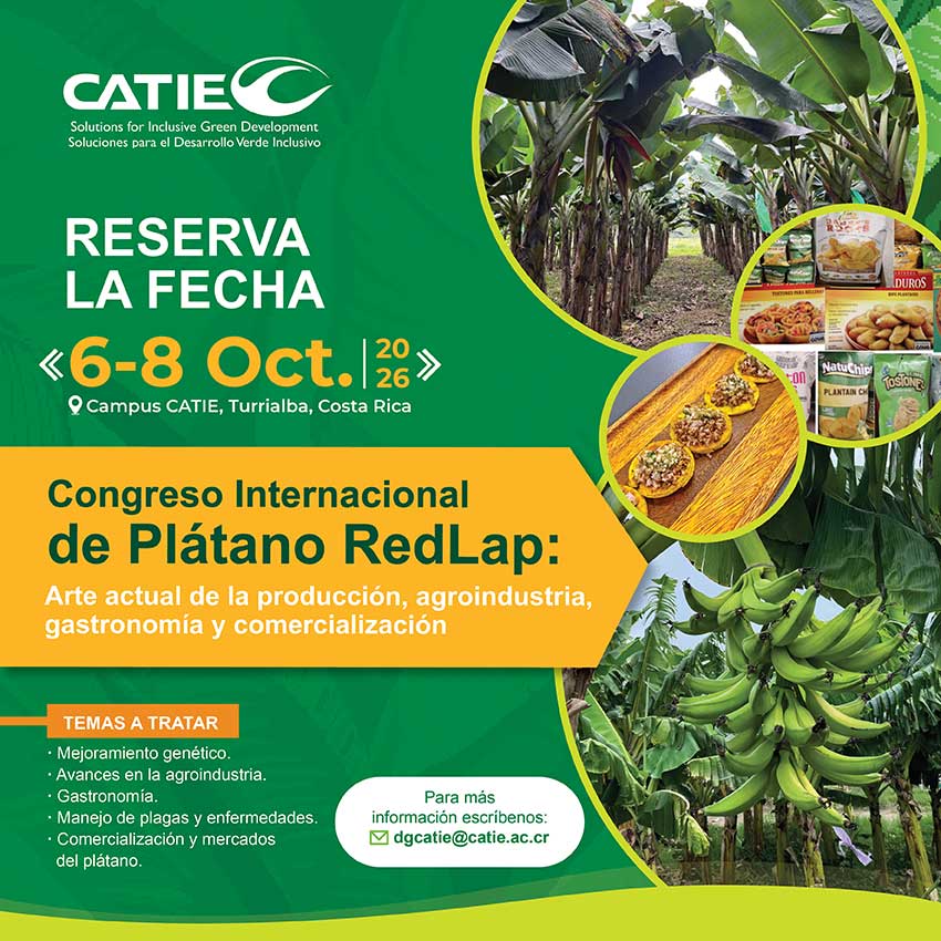 CATIE (Tropical Agricultural Research and Higher Education Center) officially announces the Save the Date for the RedLAP International Plantain Congress 2026, which will take place from October 6 to 8, 2026, on CATIE’s campus in Turrialba, Costa Rica. The event will convene key actors from the plantain sector across Latin America and the Caribbean to exchange knowledge, technologies, and innovation opportunities.
